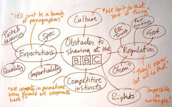 What stops the BBC from sharing content, technology and resources with the outside world? Actually, the number one obstacle, if the many conversations I’ve had here at the BBC over the last few weeks are anything to go by, is rights. Rights rights rights. Rights rights rights rights rights. The Gordian knot of multiple, overlapping rights regimes and multiple historic rights owners for every asset in the BBC’s catalogue. But I’m here to tell you that there are other obstacles to sharing—many in fact. This chart is a first attempt at capturing all the reasons the BBC might come up with for not opening up…